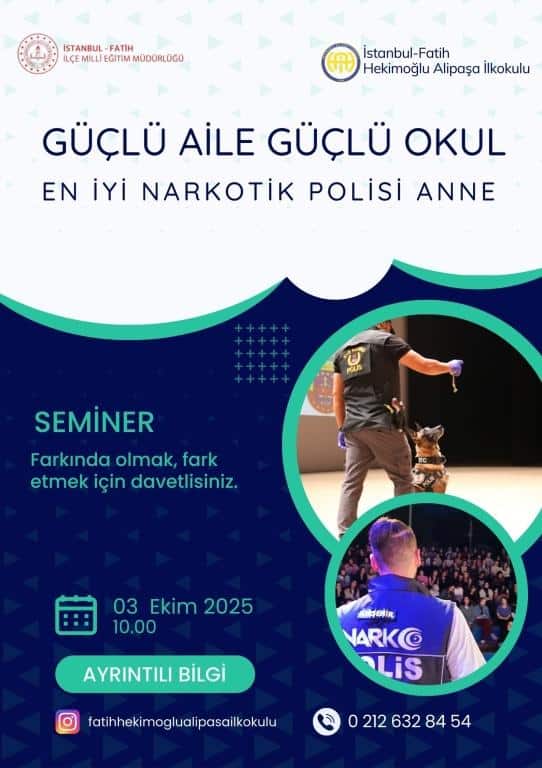 Güçlü Aile Güçlü Okul En İyi Narkotik Polisi Anne semineri 3 Ekim 2025 tarihinde saat 10.00 da okulumuz çok amaçlı salonda yapılacaktır.